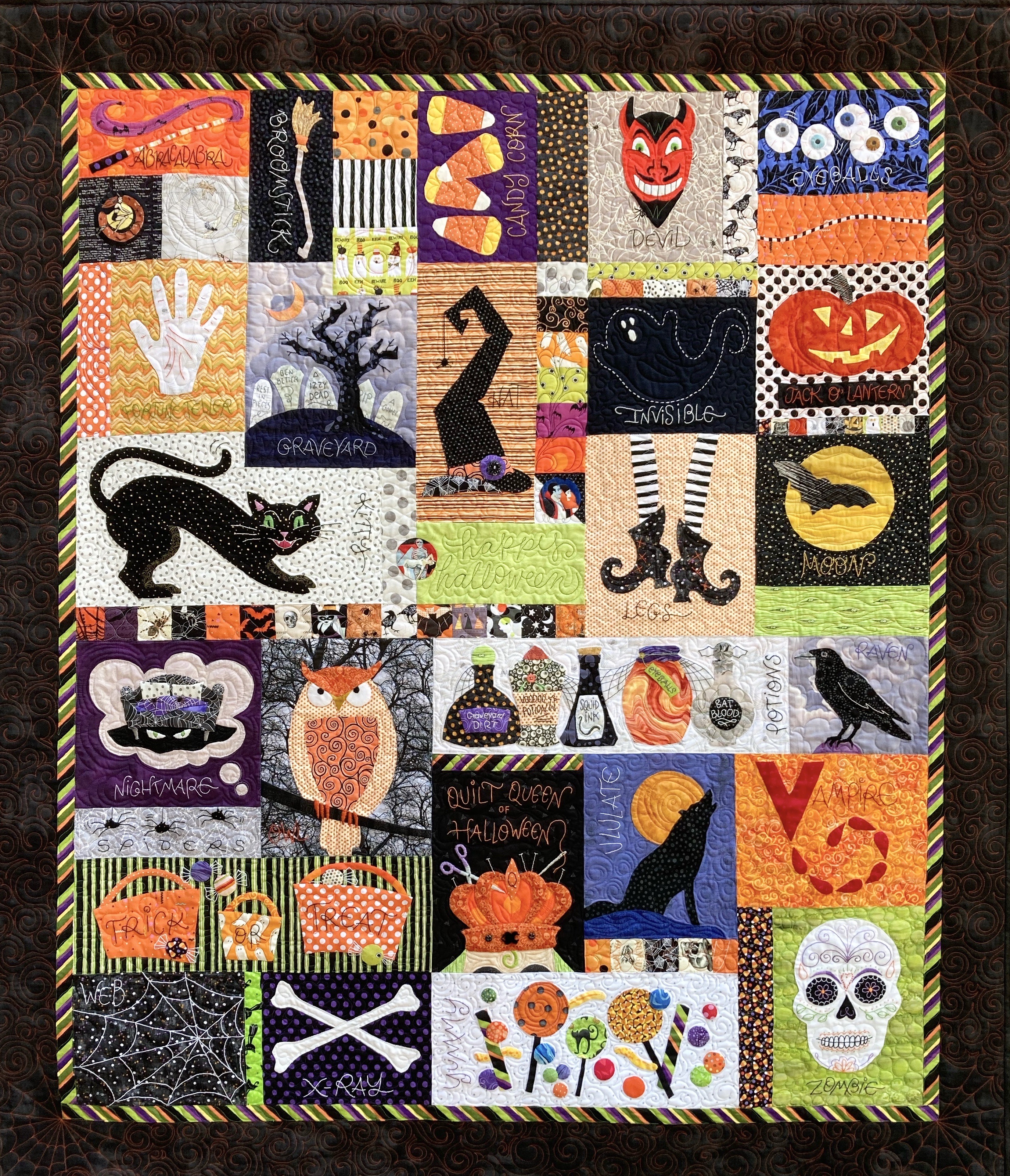 Here are the basics of this quilt: The finished size, with borders, is 60.5" by 71". There are 26 alphabet blocks of varying sizes, and some in-between blocks that you can customize according to your likes and what your stash has to offer. It is not necessary to have a huge array of Halloween fabrics, but you will need oranges, blacks, greens and purples in addition to touches of other colors to round out the design.